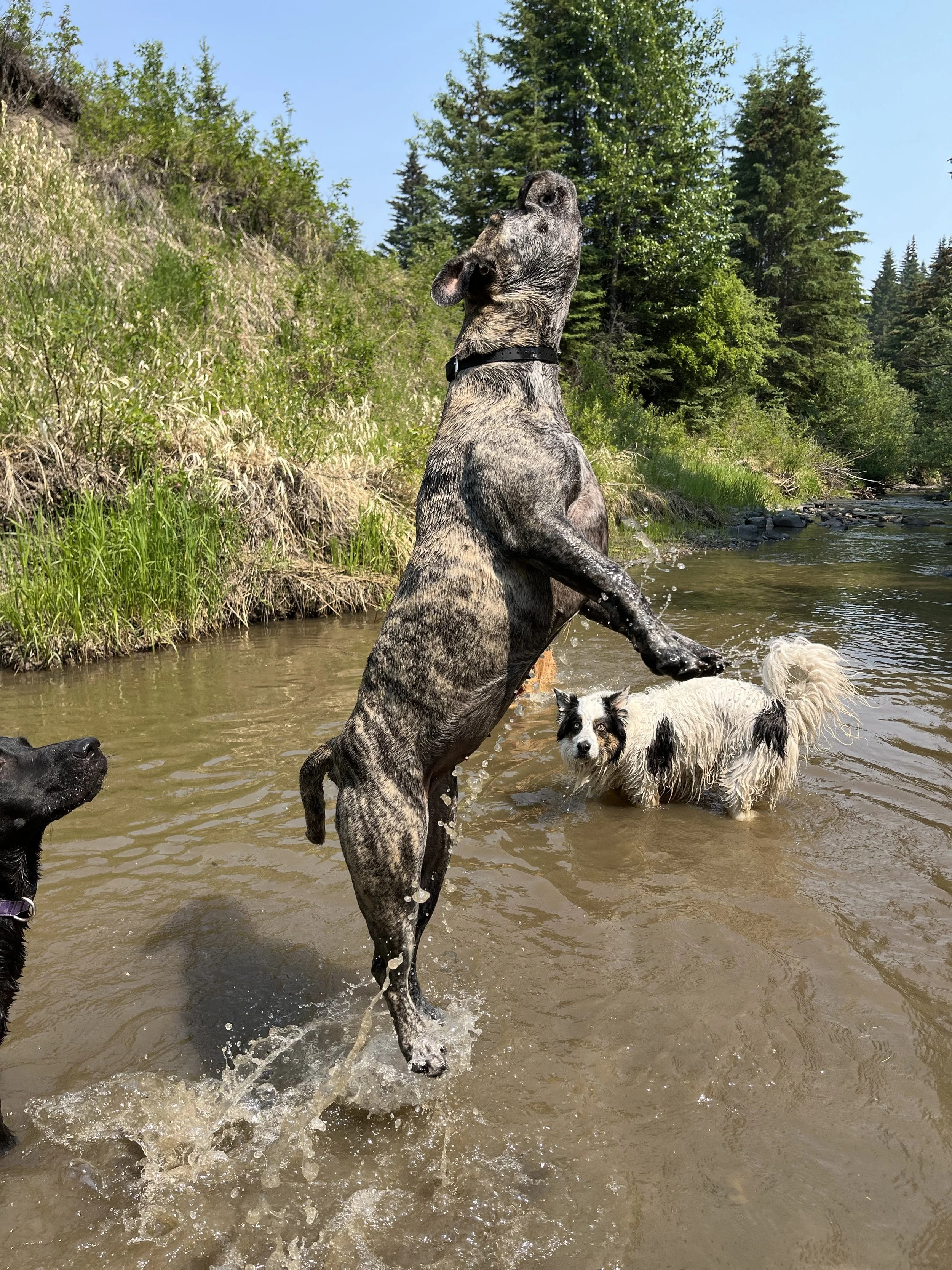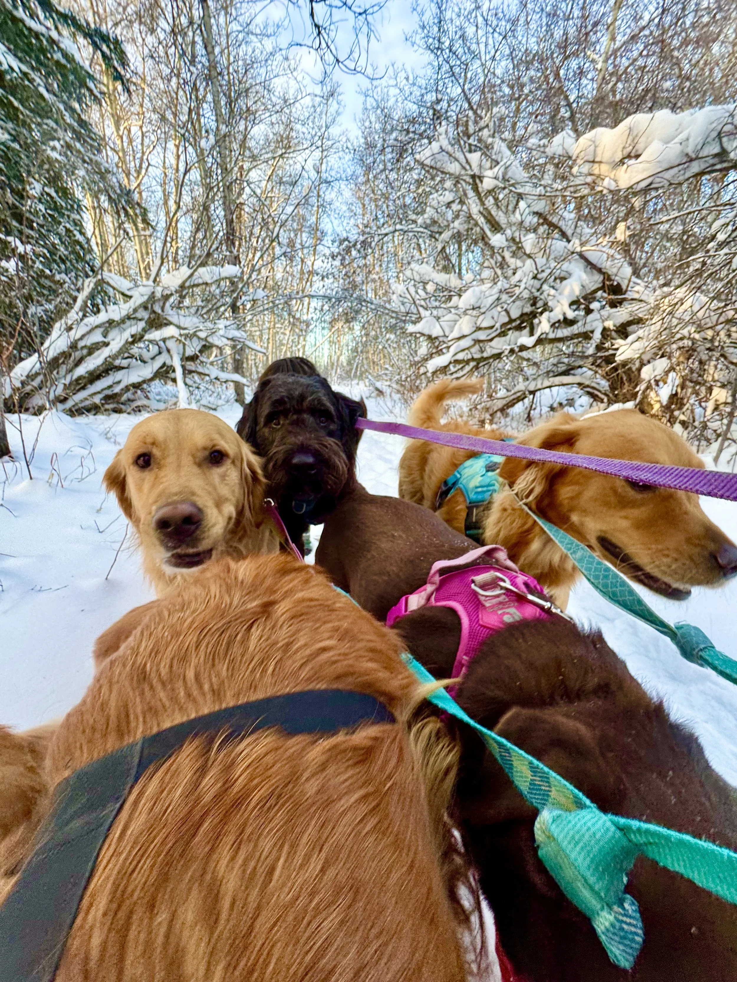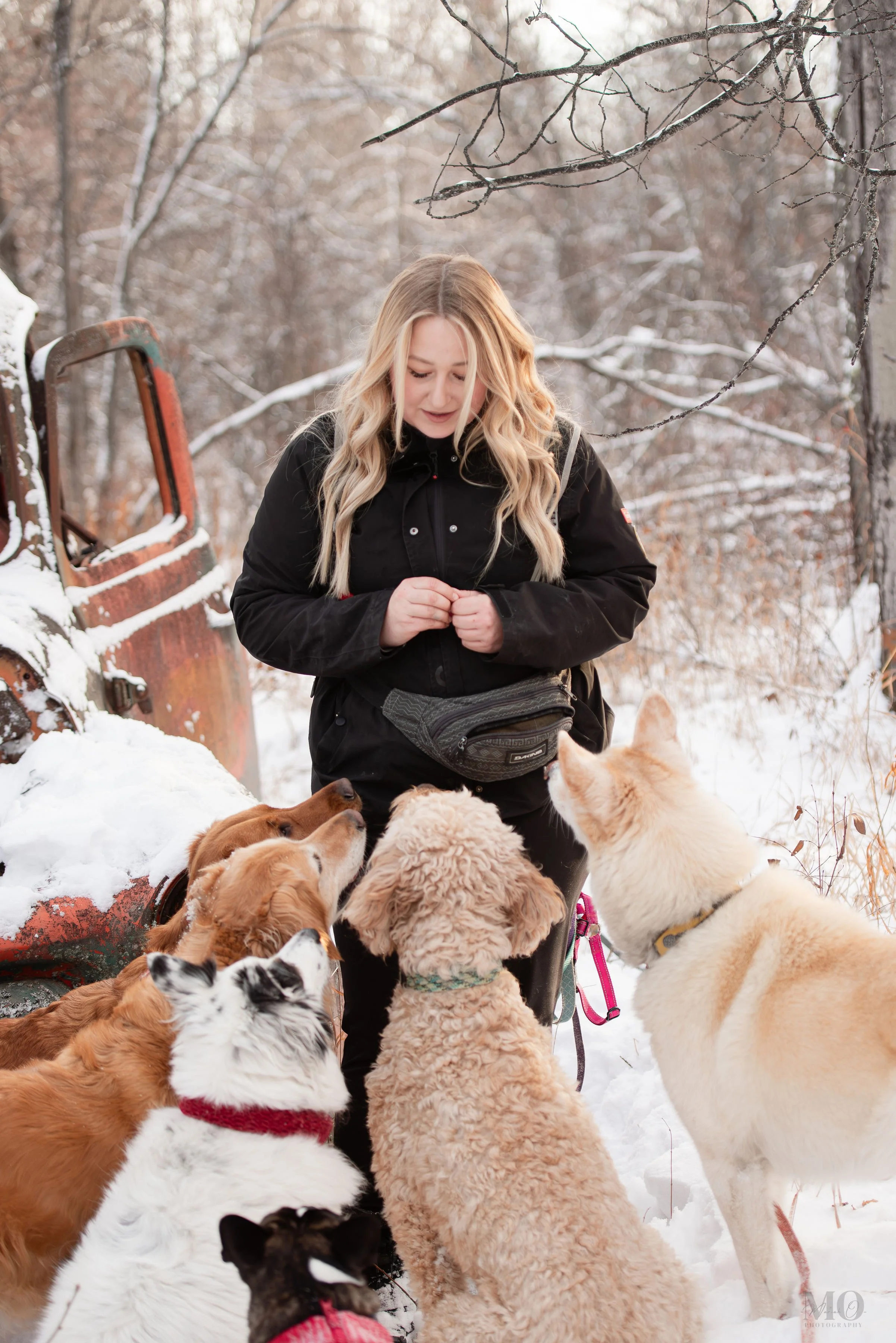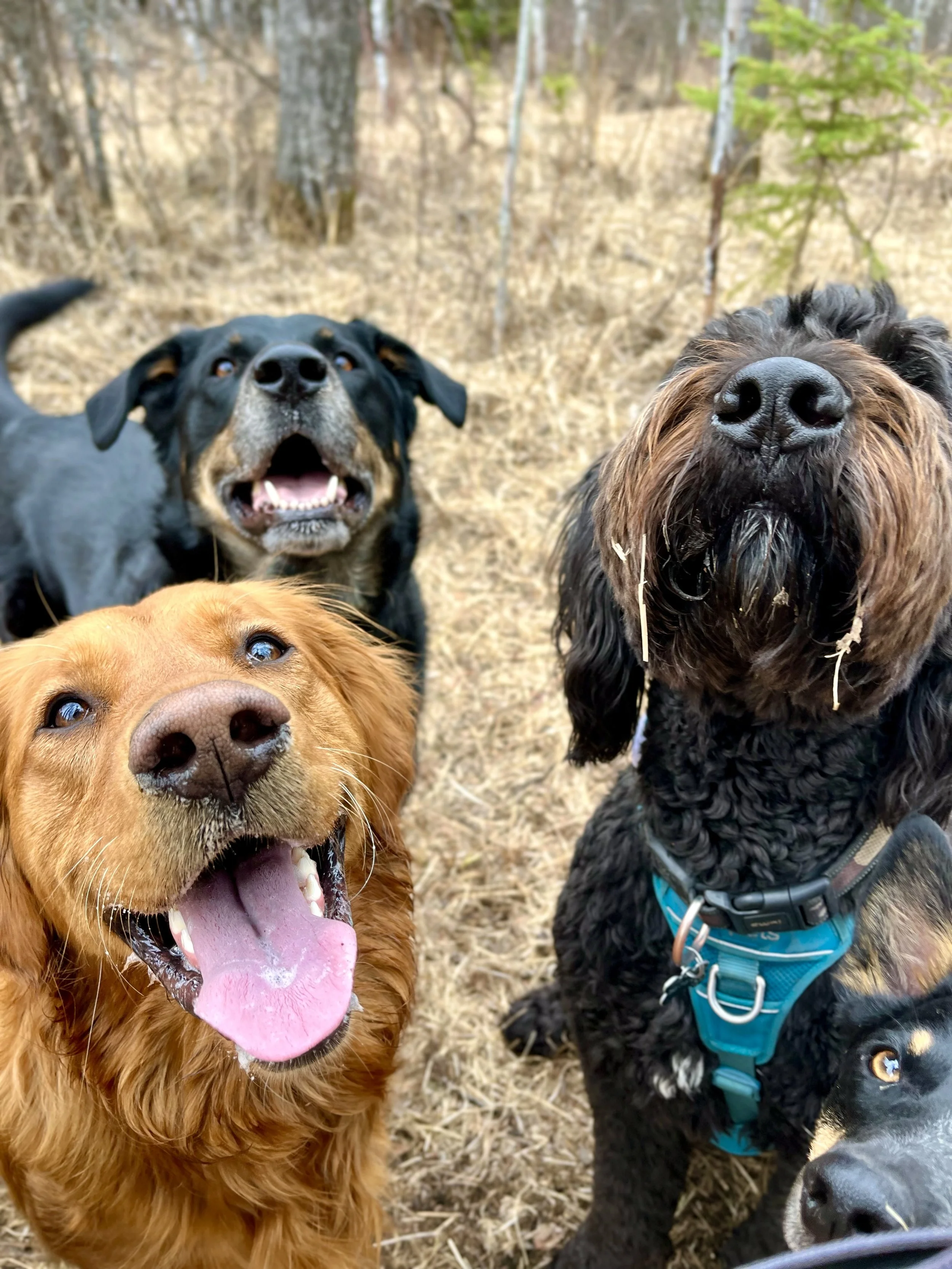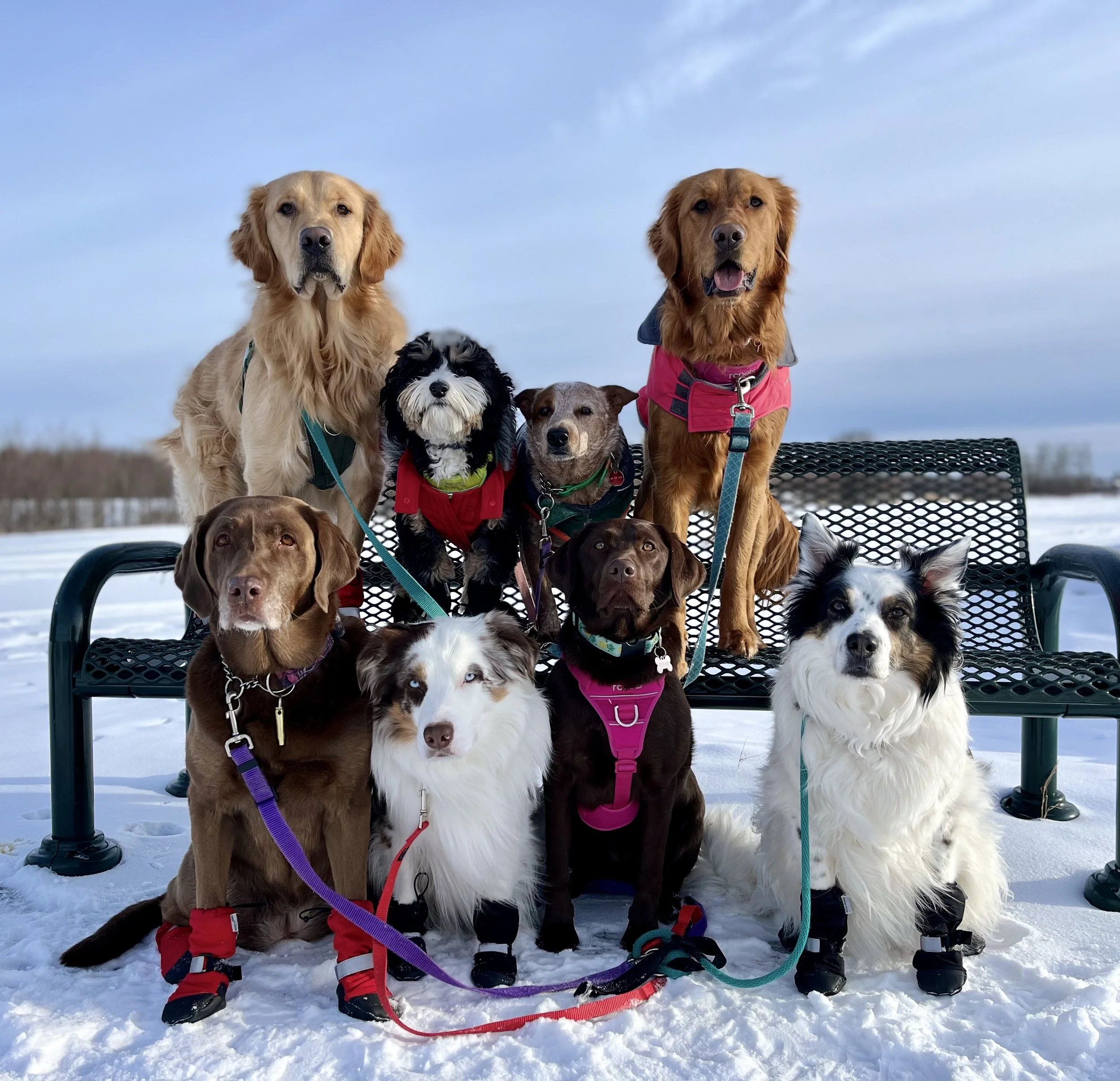 Our Large Group Walks aren’t just a romp in the woods, they’re structured, purposeful outings designed to challenge your dog’s mind and body. With up to 8 well-matched dogs per group, these 75-minute walks blend off-leash freedom with real-life training, creating the perfect balance of discipline and fun.