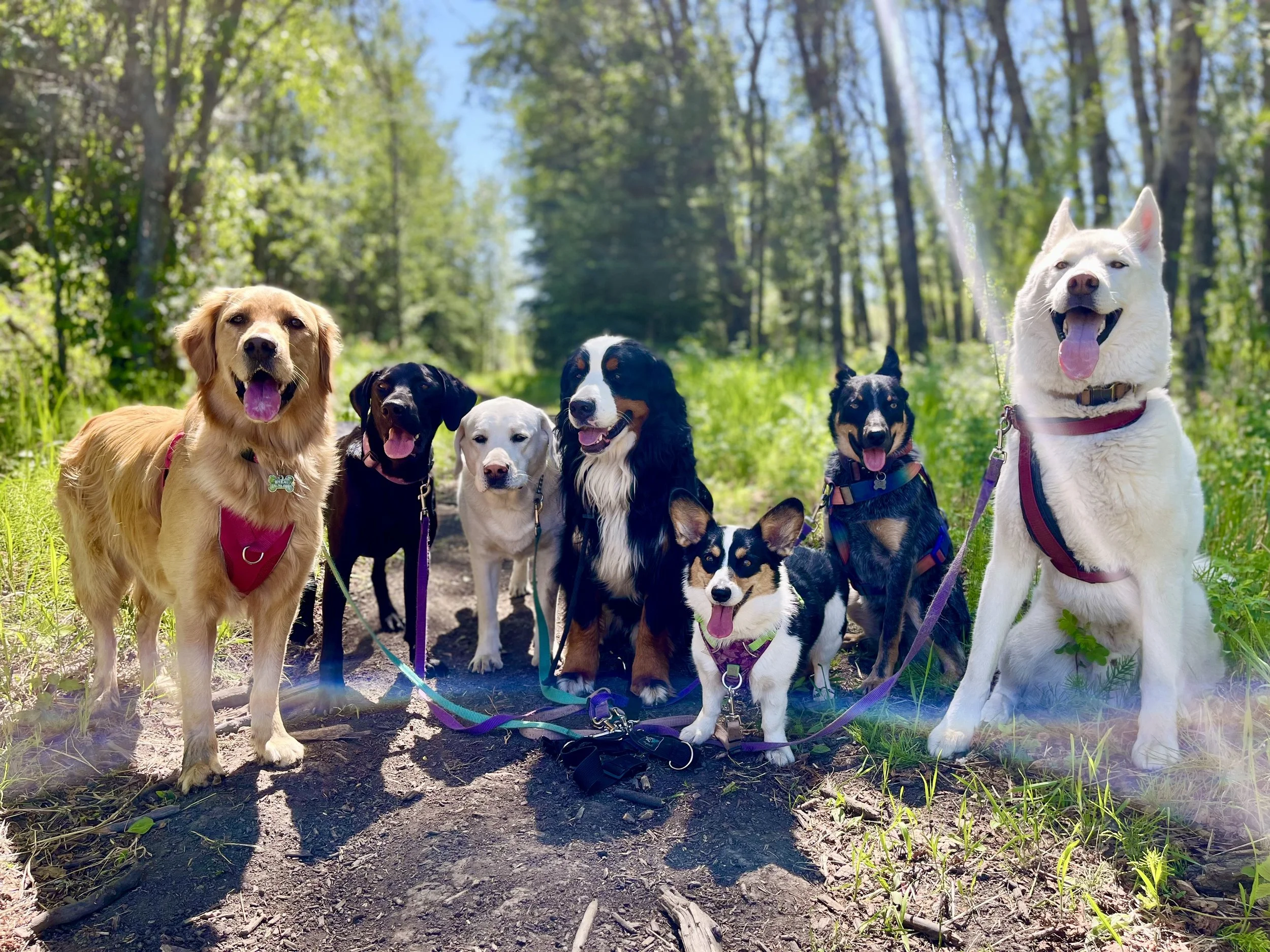 Our large pack walks are well organized and designed to keep every dog safe and happy. Dogs are matched by temperament and energy level, and we follow clear routines to make sure the group stays calm, structured, and enjoyable for everyone